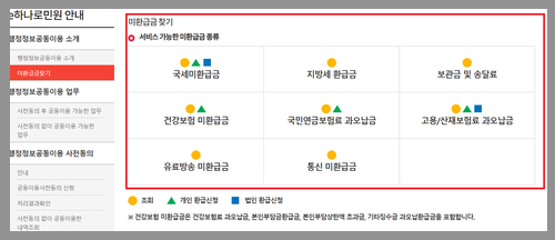 - 좌측 메뉴에서 「미환급금찾기」 선택 → 3. 하단의 「미환급금찾기」 선택