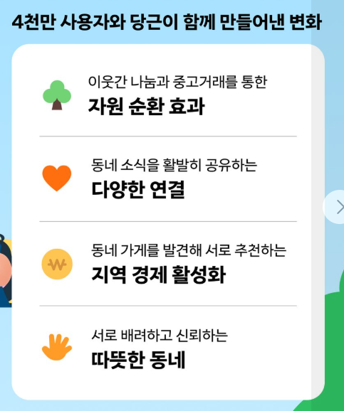 당근마켓은 단순한 중고거래를 넘어 생활형 커뮤니티 서비스로 확장되었습니다. 구인구직, 나눔, 지역 정보 공유 등 다양한 기능을 제공합니다.